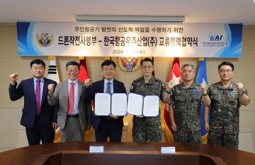KAI(한국항공우주산업㈜)는 24일 국군 드론작전사령부와 유·무인 복합체, 드론, AAV(미래비행체), 차세대 무인기 분야에서의 교류 확대를 위해 ‘상호 협력 및 지원을 위한 KAI의 CS센터장 이상재 전무와 드론작전사령부 김용대 사령관을 비롯해 양 기관의 주요 관계자들이 참석한 가운데 업무협약(MOU)’을 체결했다.