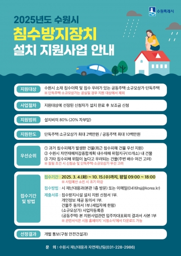 수원시(시장 이재준)가 풍수해로 인한 건축물 침수 피해를 예방하기 위해 ‘2025년도 침수방지장치 설치 지원사업’을 전개한다.