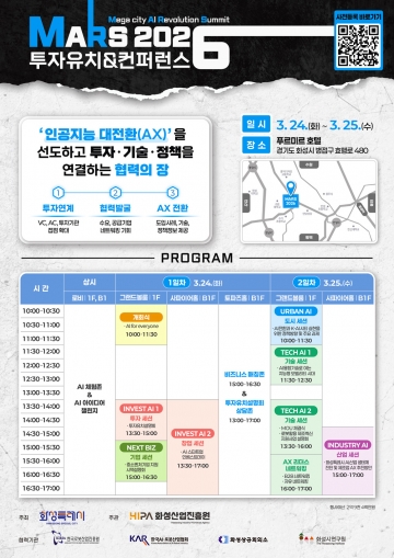 화성특례시(시장 정명근)가 오는 3월 24일부터 25일까지 이틀간 푸르미르 호텔에서 「MARS 2026 투자유치 & 컨퍼런스」를 개최한다.