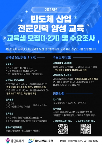 용인시산업진흥원(이사장 이상일)은 반도체 산업 분야의 실무 역량을 갖춘 인재를 양성하기 위해 '2026년 반도체 산업 전문인력 양성 교육' 1·2기 교육생을 모집한다.