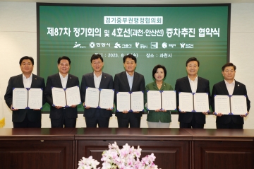 군포시(시장 하은호)은 9일 열린 제87차 경기중부권행정협의회를 주재하고 과천시(신계용 시장)가 제안한 증차안을 협의 과천·안산·안양·시흥·광명·군포·의왕시 7개 시장이 4호선(과천~안산선) 중차를 위한 협약을 체결했다.